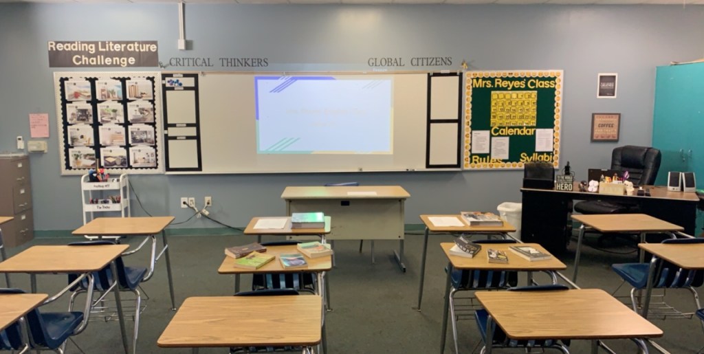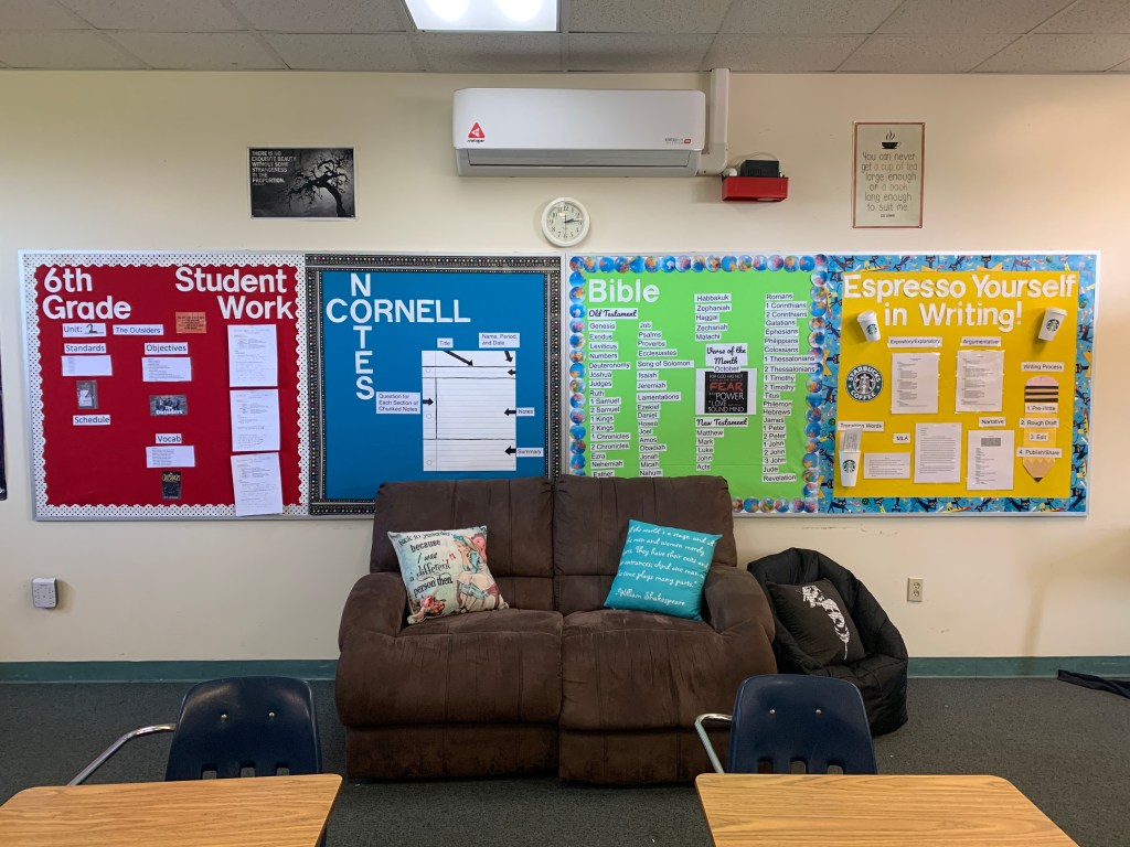 Lastly, I have unit boards in the back of my classroom which would change with my units. I have a 6th grade English board to the left. It includes the standards, objectives, schedule, pictures, and vocab for that unit. It is also where I display student work. Furthermore, I had a Bible board because I was teaching Bible at the time. It includes the books of the Bible and a Verse of the Month.