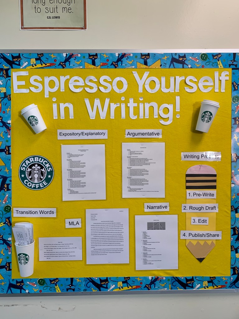 I created this Espresso Yourself in Writing board because writing seems to be the most difficult task for my students. I posted MLA rules for papers and works cited pages. Also, I put sample transitions in a Starbucks cup and the writing process on a pencil made of card stock. Lastly, I had outlines of the 3 types of writing I teach: Argumentative, Narrative, and Informative/Explanatory.