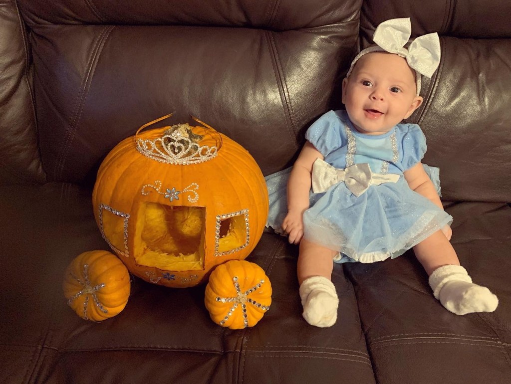 On my actual birthday, we carved pumpkins. I chose to carve this Cinderella carriage pumpkin for this photo in particular. I bought the pumpkin and mini pumpkins at my local supermarket. I bought the stick on rhinestones at Michaels. The crown (https://amzn.to/3uB5jtr) and Cinderella costume (https://amzn.to/2NFMIvG) were from Amazon. I choose to take this picture on the couch so that she could lean against it and be in a sitting up position.