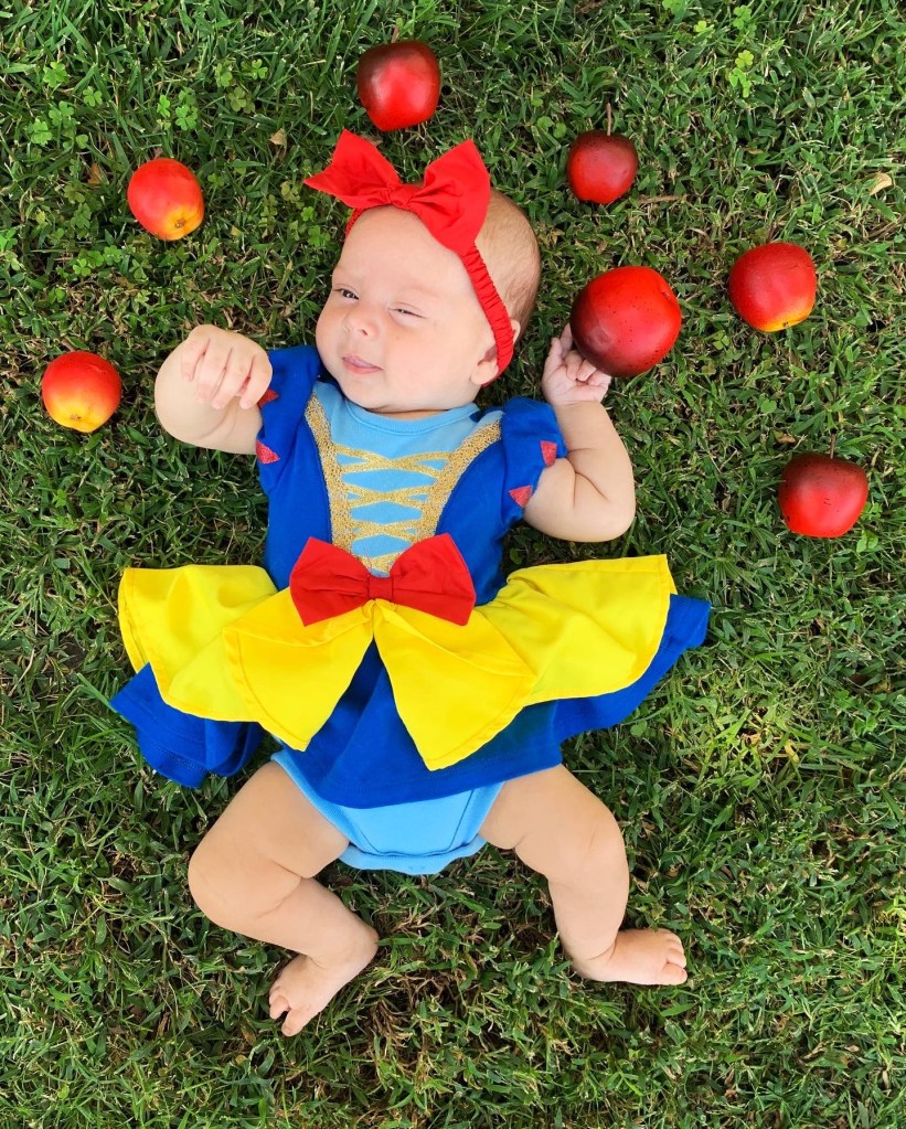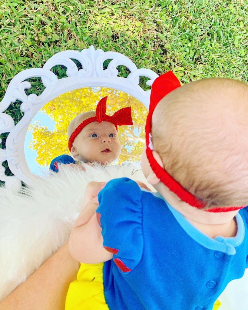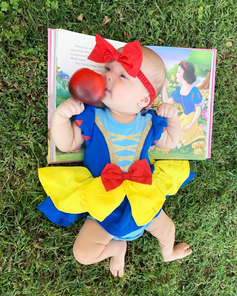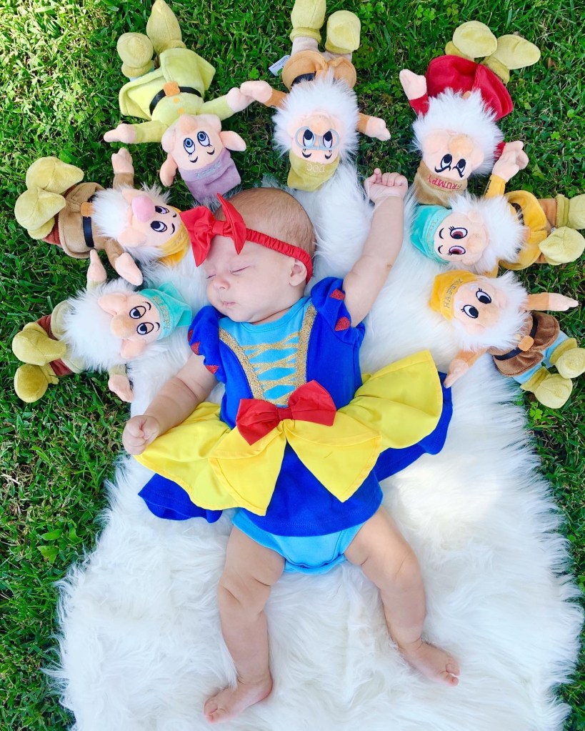 I purchased the Disney princess book (https://amzn.to/301g6id), fur rug (https://amzn.to/3dTSQLi), mirror (https://amzn.to/3b4idYQ), and Snow White costume (https://amzn.to/3uQvAEa) on Amazon. I purchased the apples from the Target dollar section. Lastly, I purchased the 7 dwarfs plushies on Mercari/Poshmark. At the time these Photos were taken, my daughter was about 2.5 months old. Therefore, she could only lay on her back. Her neck was strong enough that she could hold it up, but she could not use her arms to push up yet. As such, in the photo with the mirror, you can see I am holding her up. The mirror photo would have been much more successful with an older baby. Because she was small and didn’t move yet, I could just place her in the position or near the props I wanted. Next, I would stand over her and take the picture. The props are what really made these photos so special.