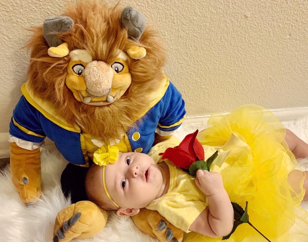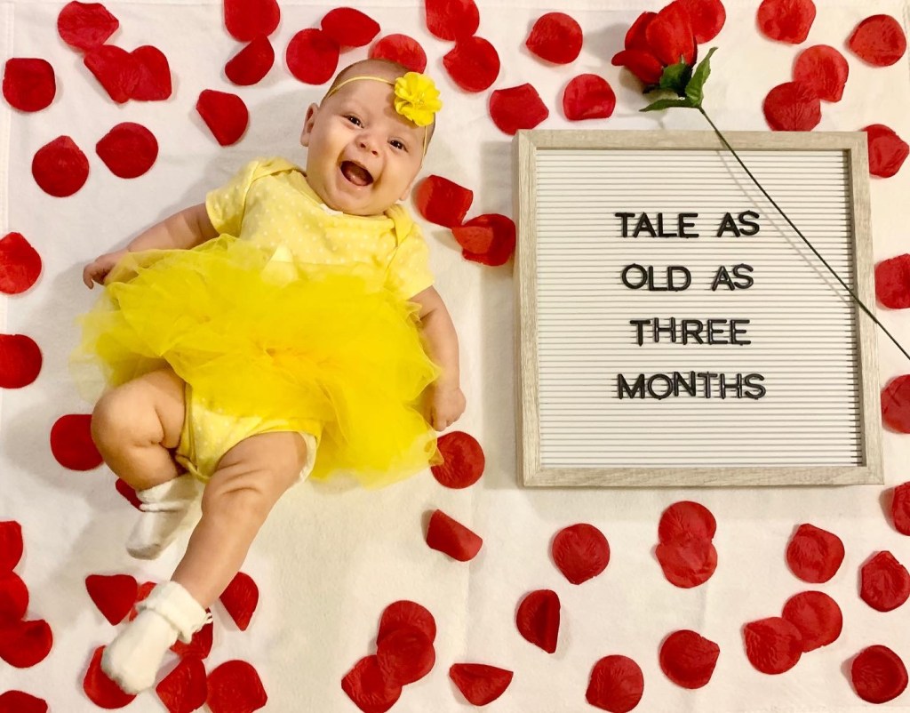 In these photos, I got the rose prop from the Dollar Tree and the Beast Plush off of Mercari/Poshmark. I got the milestone blanket, yellow tutu, and yellow headband from Etsy. The writing board was bought at Target, and the artificial rose petals were purchased at Party City. I made the milestone marker from wooden embroidery hoops, artificial eucalyptus, and floral wire from Michaels. I got the fur rug (https://amzn.to/3dTSQLi) and yellow onesie (https://amzn.to/2PoCwbr) from Amazon. In these photos, she was, once again, on her back because she couldn’t quite sit up assisted yet. I did try to take some with her and the beast on her side, but she wasn’t very happy about that position. Thus, I took the pictures standing over her while she was on her back. As you can see in these pictures, she was finally starting to mimic me and give me big smiles in her pictures.