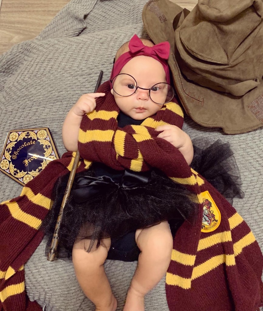 Quincy was still not quite 3 months old in these photos. I got the scarf, chocolate frog ceramic box, and wand off of Poshmark/Mercari. The sorting hat was purchased from Target, and the tutu came from Etsy. The Black onesie (https://amzn.to/2ZXkjUn), Harry Potter glasses (https://amzn.to/3sAdX9t), and headband (https://amzn.to/3kE3NSz) came from Amazon. The books were from my childhood. I can’t wait to read them to Quincy when she is older! She was able to lift her head slightly while on her stomach, so the books pictures turned out extremely cute. I also took photos of her laying on her back. At this point, it was not possible to get her smiling in pictures, but one week later, I couldn’t get her to stop smiling. I stood over her for the pictures where she is on her back, but I sat on the floor and laid on the floor to take the book photos.