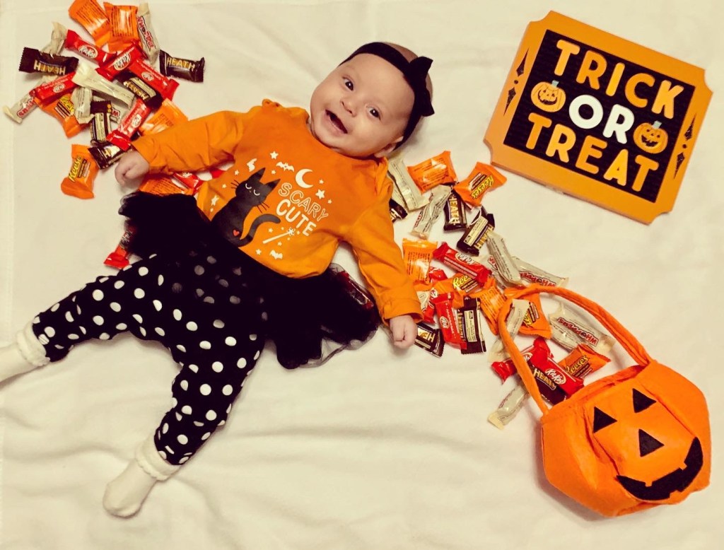 These props were bought at a variety of places. The trick or treat sign was purchased at Target. The candy and pumpkins were purchased at the super market. The jack-o-lantern candy bag was purchased on PatPat. The vinyl sticker that reads “Quincy’s First Halloween” was purchased on Etsy. The hay barrel was a decoration my mom already had in her house. The Scary Cute outfit and the spider web onesie were purchased on PatPat. BEWARE: their sizes run big. The black onesie (https://amzn.to/2ZXkjUn) and black headband (https://amzn.to/3kE3NSz) were purchased on Amazon. To get the sitting inside pumpkin photo, my mom and I placed the pumpkin on top of a box that we covered with a table cloth. We decided to elevate her onto the box so that her legs could dangle because she was uncomfortable when we tried setting her on the ground. Furthermore, this photo was challenging because it required my mom being close and ready to catch Quincy if she tipped over. It also required us trying to console a grumpy baby who didn’t like being in the pumpkin. As you can see, the pumpkin photo was really difficult to do, and for the photo I got, it probably wasn’t worth it. The candy photo and spiderweb pumpkin photos were much easier to take and required less hurdles to jump.