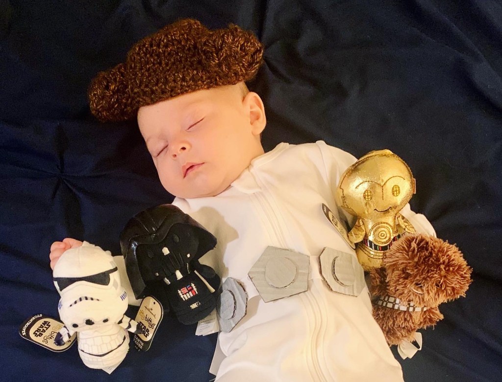 These photos were taken on Halloween. Our Family chose Star Wars because Quincy’s middle name is Leia after Princess Leia. The Itty Bitty props were purchased on Amazon and eBay (see amazon links below). Also, Quincy’s white onesie (https://amzn.to/3dVs8Sz) was purchased on Amazon. I made her belt with white ribbon, cardboard, and a silver sharpie paint pen (Target). First, I cut the cardboard pieces. Then, I hot glued the circles to the pentagon and hexagon pieces. Lastly, I hot glued those completed pieces onto the ribbon. Quincy’s Leia yarn wig was made by a friend with yarn bought at Michaels. This photo was taken on a bed. At the time these photos were taken, my daughter was very tired. She ended up falling asleep as you can see in the last picture. To take these photos, I stood at the edge of the bed and pointed the camera down at her. She was positioned close to the end of the bed in the center. My husband’s Darth Vader (https://amzn.to/2O8YzC6) and my Queen Amidala (https://amzn.to/3kwSLhS) costumes were purchased on Amazon as well. My white make up was purchased on Amazon. I first put a white stick foundation (https://amzn.to/3b140Mh) on, then I put a white powder (https://amzn.to/301Vzdo) over it to make it stay. Next, I used a red lip liner pencil to outline the top lips, to outline the strip on my bottom lips, and make the circles on my checks. Finally, I used lipstick to fill in the lines.