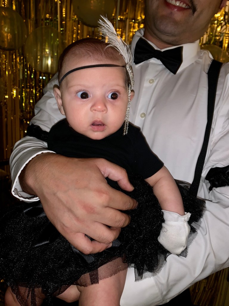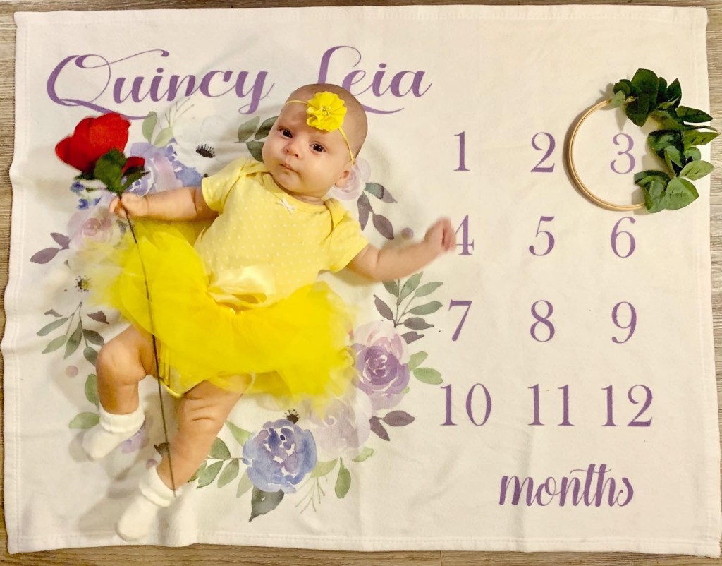 This wasn’t a photoshoot, but I did dress Quincy up for my 30th birthday party. The tutu and headband were purchased from Etsy. The mittens and socks were from Carter’s. The black onesie (https://amzn.to/2ZXkjUn) was purchased from Amazon. She was about 3 1/2 months old in these pictures.
