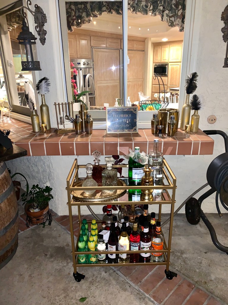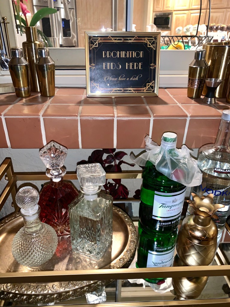 I purchased most of the alcohol on Total Wine, and was gifted some by friends and family. However, I did purchase some of the syrups (https://amzn.to/3b34odw, https://amzn.to/3r8O8xe) on Amazon. The bar cart ( https://amzn.to/3bNEv0o) and two of the glass decanters (https://amzn.to/37UsVz8, https://amzn.to/3r3YMFd) were purchased on Amazon. The remaining decanter, shakers, and other drink making items were purchased on Mercari and Poshmark. The sign that says “Prohibition Ends Here” was purchased on Etsy and the frame (https://amzn.to/3szeOrc) was purchased on Amazon. See above for information about the spray painted bottles. To make the champagne tower, I used plastic coupe glasses purchased from Party City, tealights purchased from Target, and pearls (https://amzn.to/3dPNYa5) purchased from Amazon. I hot glued the cups to one another and draped random strings of pearls throughout. I chose this plastic option so that there would be no risk of broken glasses.