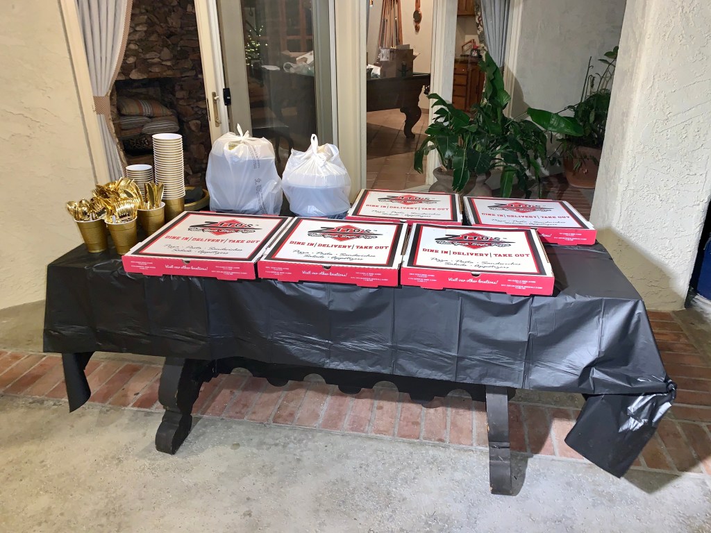 Next, we will look at the food table. We catered from Zito’s Pizza in Anaheim Hills. We got their salad and various large pizzas. The cups, Table Cloth, and plates were purchased from party city. We chose to use a plastic table cloth because this area could get messy. The gold utensils were purchased on Amazon (https://amzn.to/37Sh1WQ).