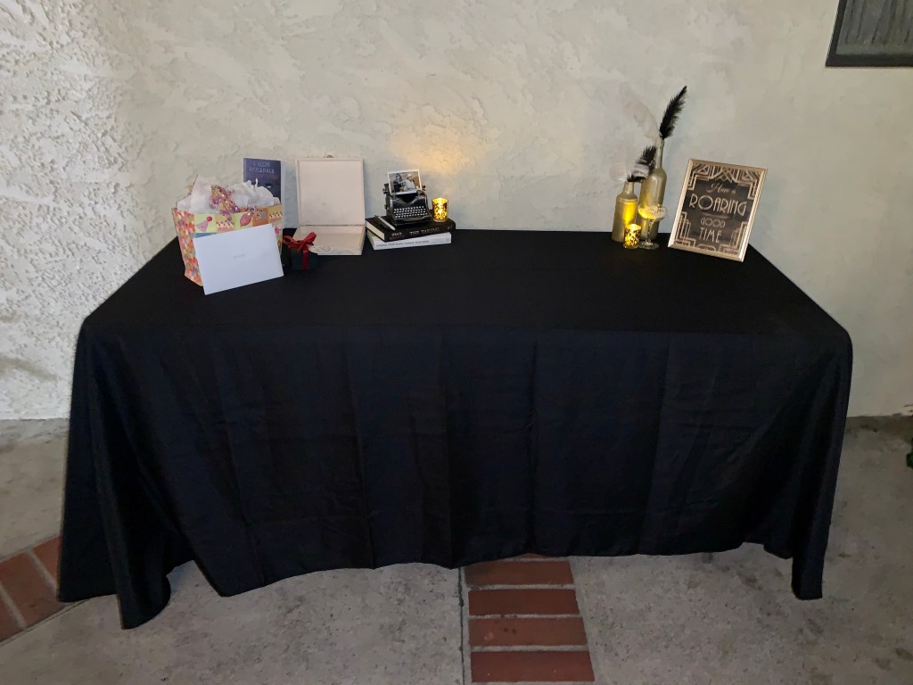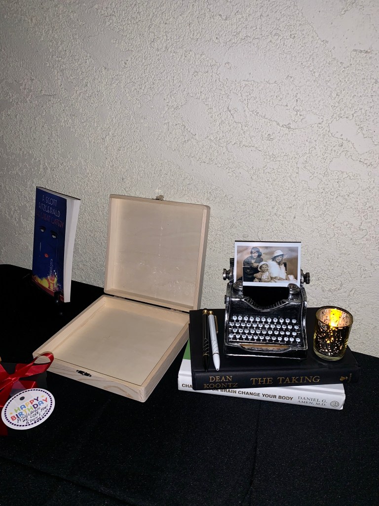 Next, guests came to my Gifts Table. I purchased the bottles at Michaels and Hobby Lobby. I spray painted them gold with spray paint from Home Depot. The cigar box was from Michaels, and the decorative books were from eBay. The feathers (https://amzn.to/37SfVdG, https://amzn.to/37XlJma), votives (https://amzn.to/2PkJDS7), 8×10 frame (https://amzn.to/3szeOrc), coupe glass (https://amzn.to/3uGWhuX), the typewriter pen holder (https://amzn.to/3sExc1T), “The Great Gatsby” (https://www.amazon.com/dp/0743273567/ref=as_glm?linkCode=ml2&tag=ashleighmarie-20) and pearls (https://amzn.to/3dPNYa5) were from Amazon. I put a picture of my siblings and I in the typewriter pen holder for a personal touch.