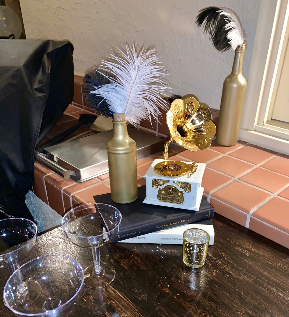 Lastly, I had some decor pieces incorporated throughout the tables that you can see below. In the first picture, the globe was purchased at Walmart. I used a paint pen to make it gold instead of the orange color it had before. The old fashioned clock was purchased at Home Depot, and the decorative books were purchased on eBay. In the second picture, We have the books purchased from eBay, the bottle purchased from Hobby Lobby, the feathers (https://amzn.to/37SfVdG, https://amzn.to/37XlJma) and votives (https://amzn.to/2PkJDS7) purchased from Amazon, and lastly a gramophone jewelry box (https://amzn.to/3aYZGgz) purchased on Amazon. In the third picture, we have an old fashioned phone purchased on Offer Up, a sign purchased from Etsy, and a frame (https://amzn.to/3szeOrc) from Amazon that reads “A Little Party Never Killed Nobody”.
