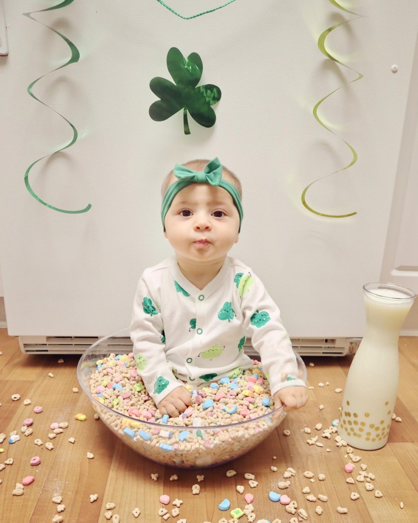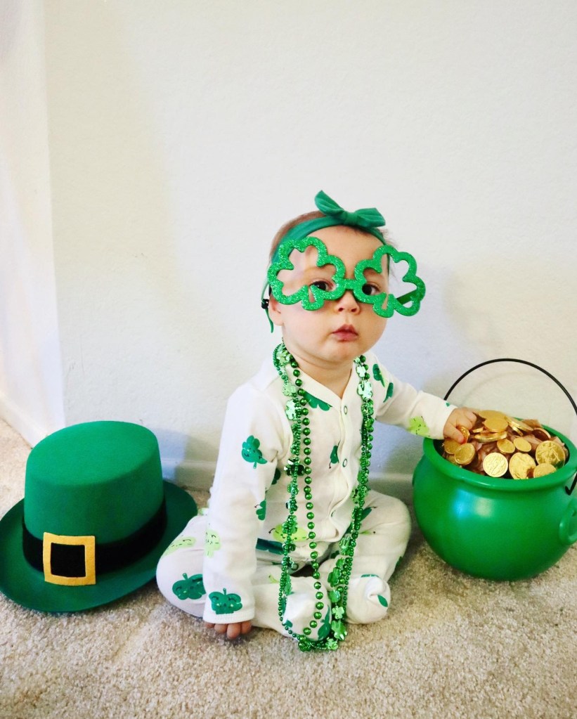 This photo was much more difficult than the previous photos to get. The reasons it was more difficult was that she was constantly moving the glasses or trying to take them off. I did use a sunglass strap (https://amzn.to/3bUFPj3) from Amazon which did help make them a little more difficult to move and stay in place. Also, she was trying to grab the gold coins. You can see her hand on them in this picture. Another issue was that she is now crawling, and would crawl off the set and come towards me. All these factors made this photo a bit more difficult to take. The cauldron was reused from her first Photoshoot. The supplies for the cauldron were bought at Party City. Quincy’s shamrock glasses came from Party City as well. The necklaces and hat were borrowed. Overall, it was fun taking these photos today and feeling a little festive. Happy Saint Patrick’s Day Everyone!!!