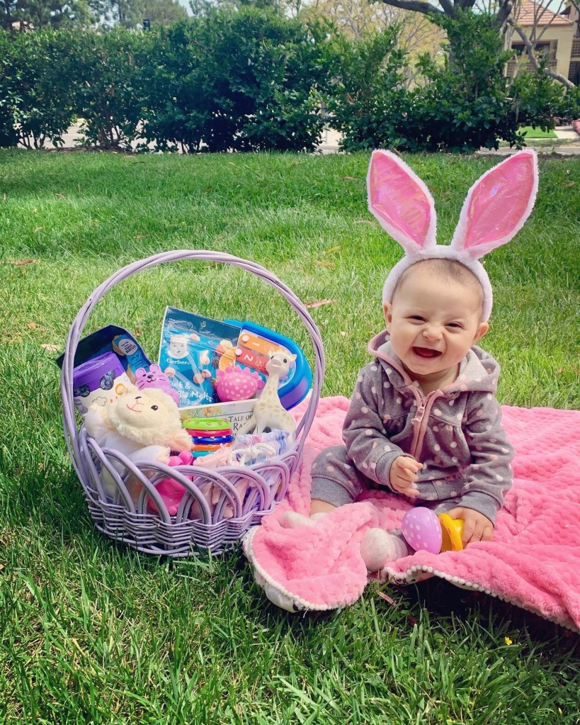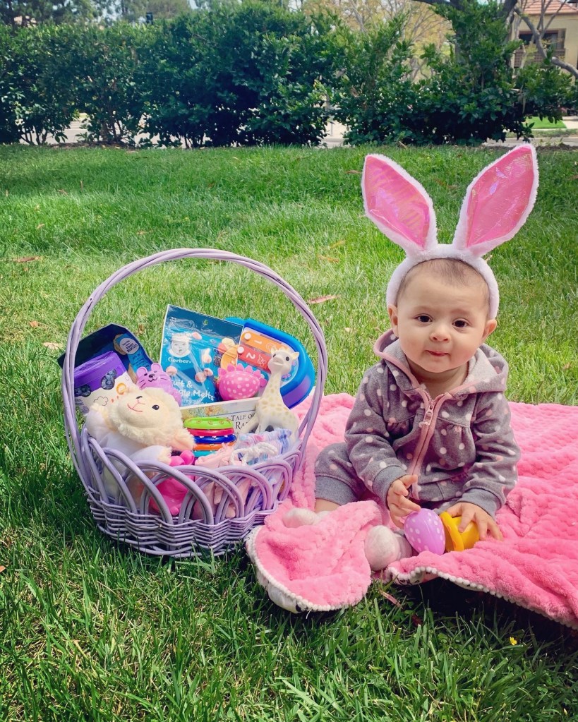 Quincy’s fleece zip-up onesie and socks are from Carter’s. Her ears are from the Dollar Tree. The purple Easter basket was purchased at Hobby Lobby for 40% off about 1 week to a week and a half before Easter. Her blanket was an Easter gift from her Aunt from the Disney Baby collection. These pictures were taken with my I-phone in front of our apartment.