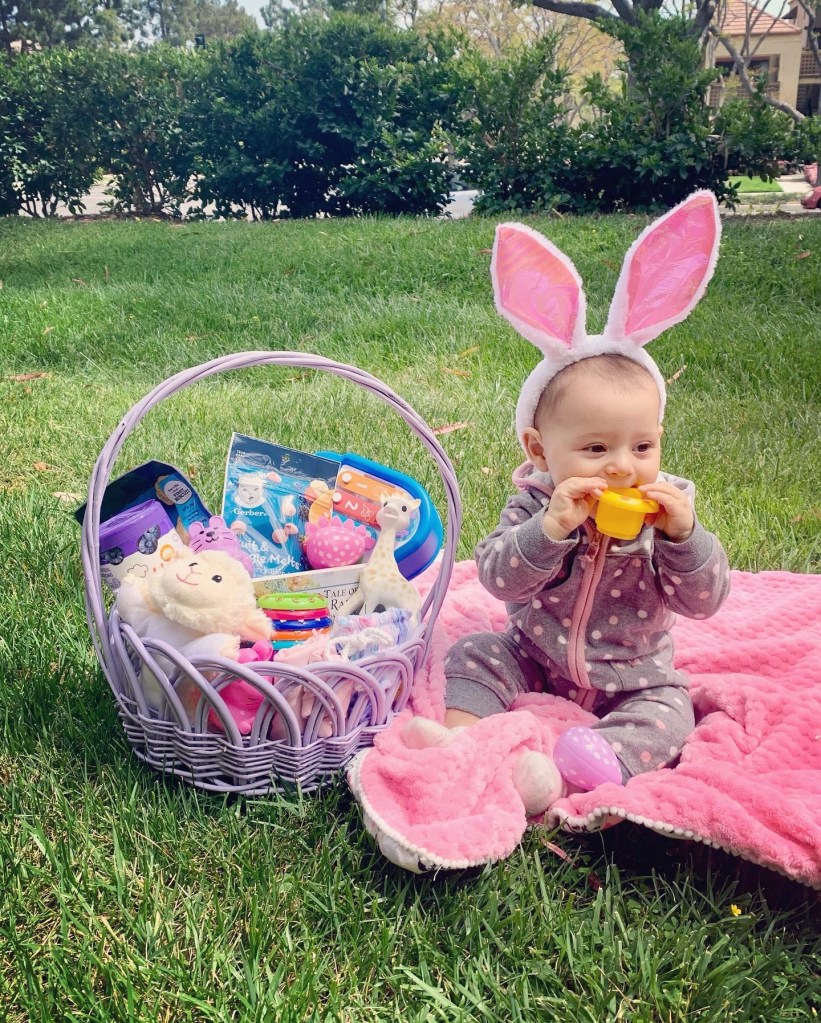 This basket was mostly needs mixed with a few fun extras. Quincy needed more snacks and clothes in her size, so those were necessities. Also, as an English Teacher, I think books are always a necessity, but this could also fit in the fun category. Another item in the middle between fun and a necessity is the Sophie La Giraffe because Quincy is teething and needs soothers/teething toys. However, the plush, xylophone, and stackable cups were for fun. Overall, Quincy already loves some of her new toys and has already eaten some of her snacks. This was a very successful Easter basket for an 8 month old. Happy Easter!