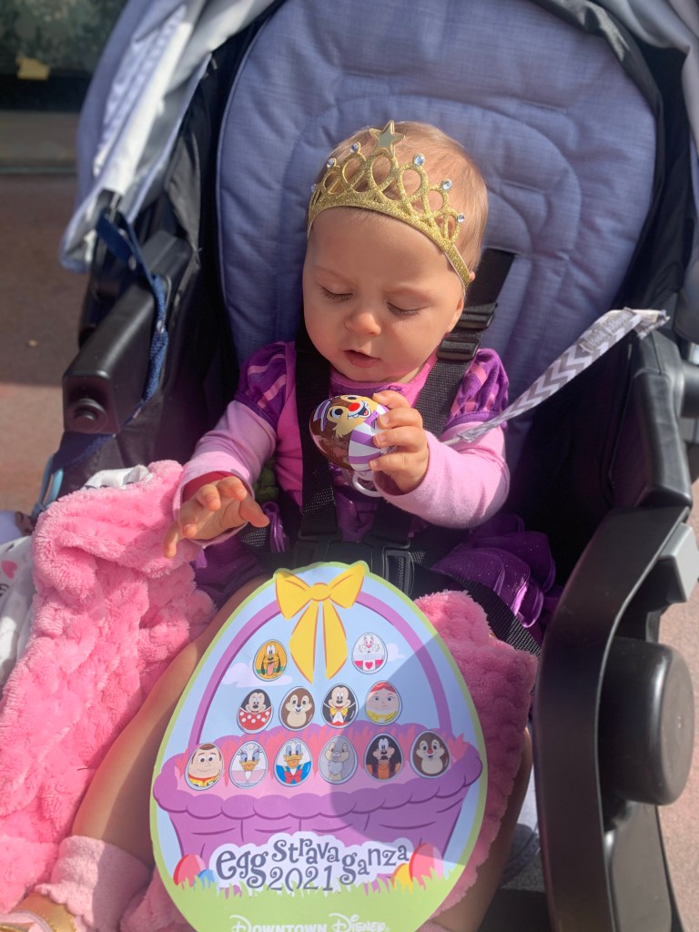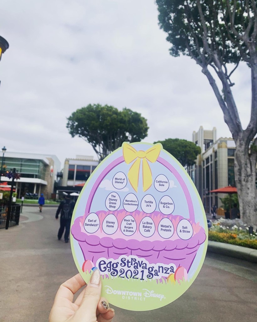 For the Eggstravaganza event, you look for large eggs around Downtown Disney. When you see an egg, you put the coordinating sticker on the game board. Once your game board is filled, you turn it in for a prize. The prize is Disney Character Easter Egg. They used to have more characters for prizes, but because we did the hunt late there was only Dale left. Spoiler Alert of a completed gameboard in the picture below if you are planning to play before they run out!