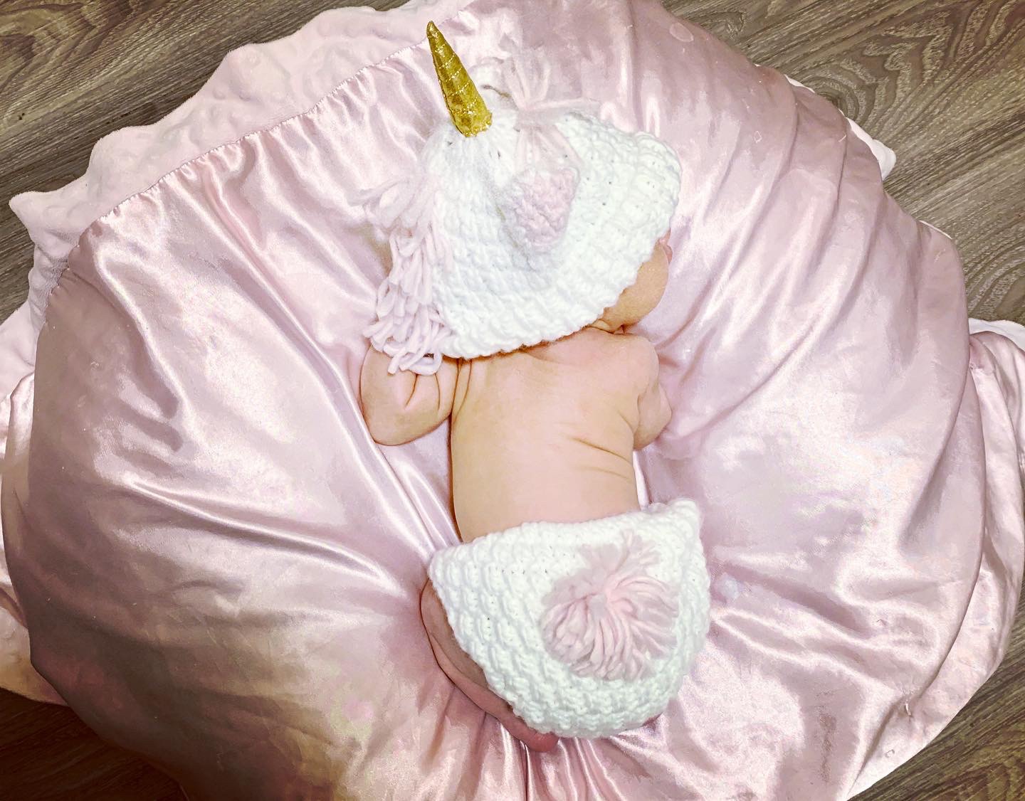 First, I placed Quincy on her stomach on her boppy pillow covered by this silky, pink blanket. I had her in this unicorn knit newborn outfit that I bought from Target. The photos came out so precious!