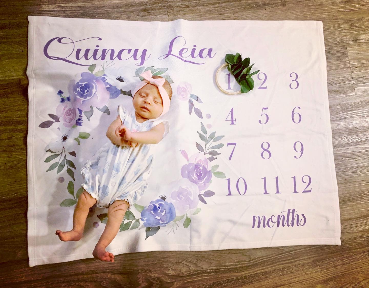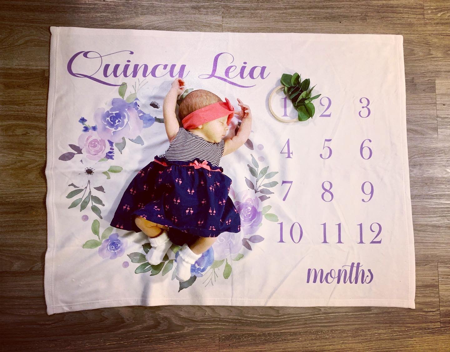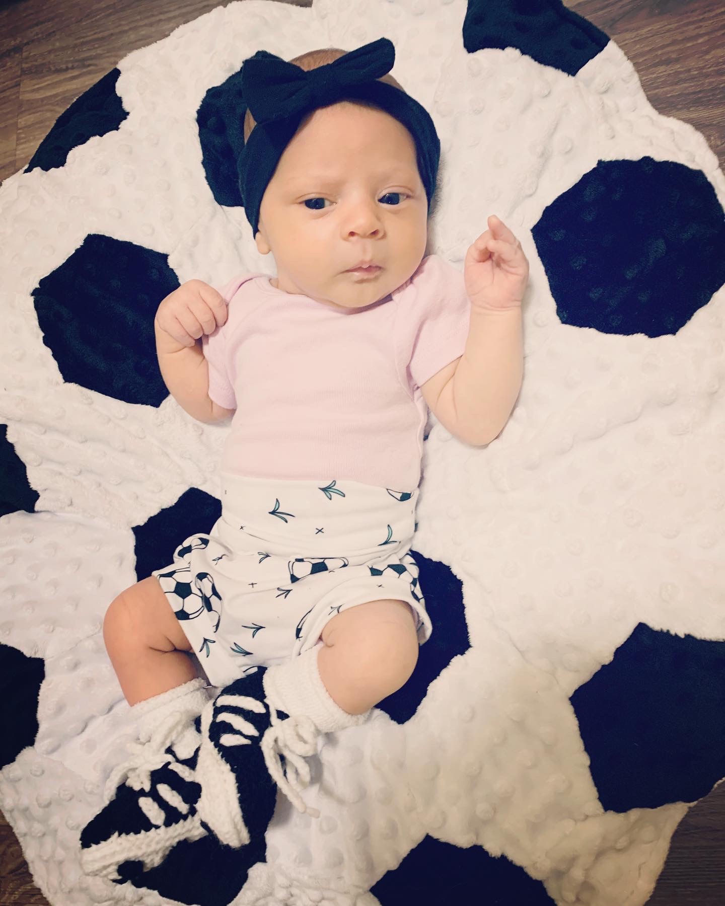 The final photo I took of Quincy was soccer themed. The onesie was purchased at Target. The soccer bunnies were purchased from Etsy. My friend gifted us the crochet soccer cleats from Etsy. Her headband is from Amazon (https://amzn.to/348oAGz). She is laying on her boppy pillow with a soccer ball blanket. The blanket was also an Etsy purchase that was a gift.