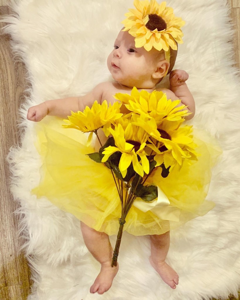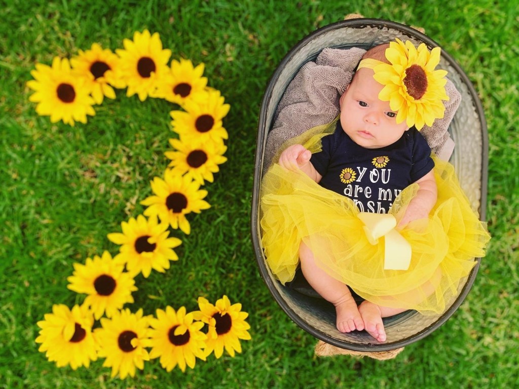 Quincy is wearing a tutu and sunflower headband purchased off Etsy. Her “You Are My Sunshine” onesie was also purchased off of Etsy. To create this photo, I used artificial sunflowers purchased at the Dollar Tree, and a metal bucket for drinks so had purchased at Home Goods in the past. I placed a grey towel inside so she would be able to lay in it comfortably. I took these photos from about a foot away with my camera pointed down.