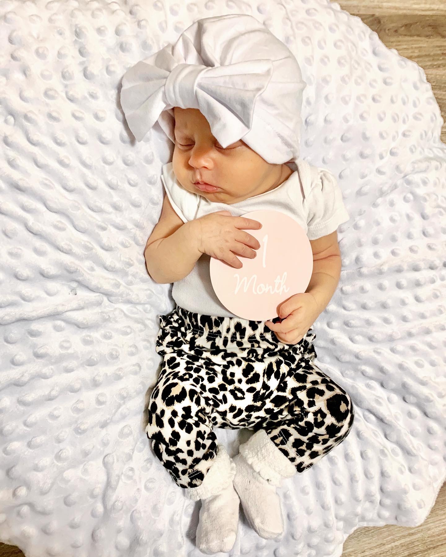 For this next photo, I placed Quincy on her boppy pillow once again with a different blanket covering it. The cheetah pants were from Old Navy. The white onesie was from Target. Her socks are from Carter’s. The beanie is from Amazon (https://amzn.to/3ffIo0M). The 1 month prop was a gift.