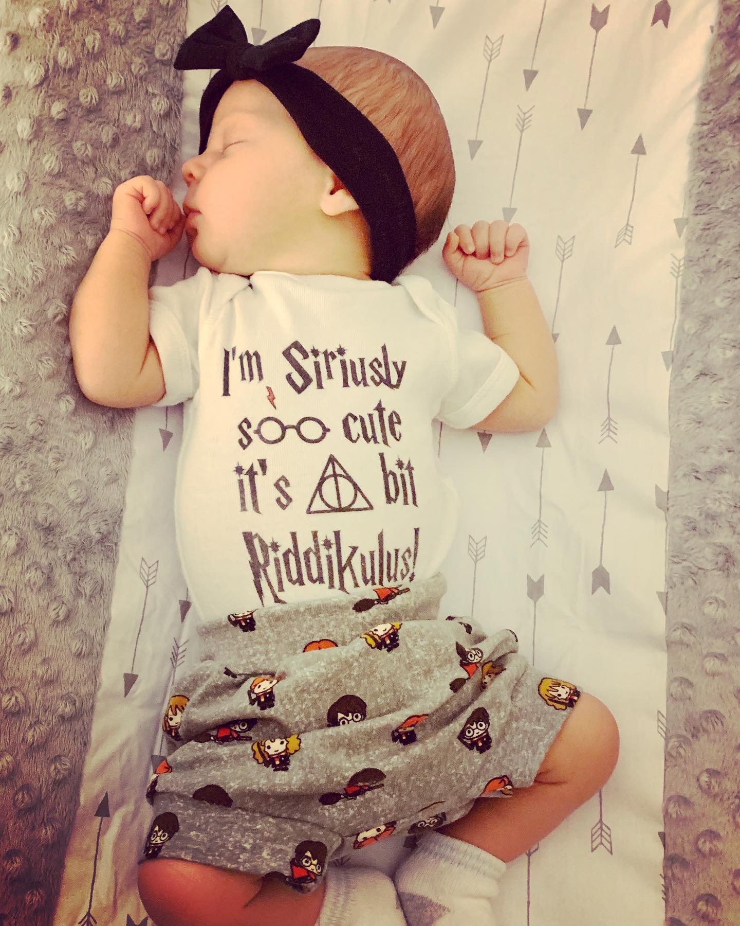This photo was taken on Quincy’s Changing table. I bought the changing table cover on Amazon (https://amzn.to/3vh0t4r), however, I believe it is also available at Target. Her Harry Potter themed onesie was purchased on Amazon (https://amzn.to/3fe8YHJ). Also, her bow was purchased on Amazon (https://amzn.to/348oAGz). The Harry Potter bummies were from Etsy.