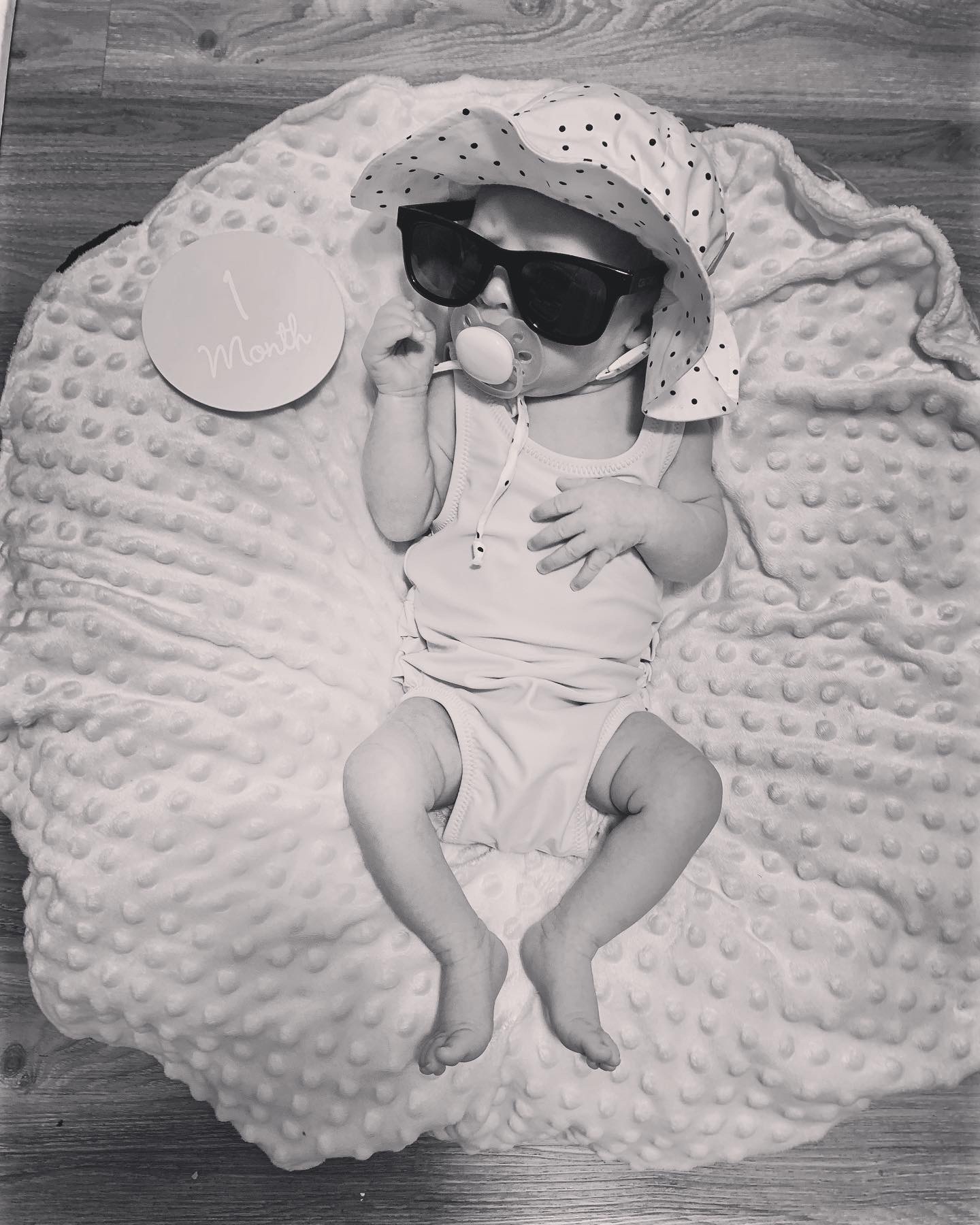 For Quincy’s 1 month Photoshoot, I had so many cute outfits that I wanted to dress her up in. She was so tiny and was like a little doll. I also could not do any professional newborn photos, so I had to create them myself. See below for my photos: