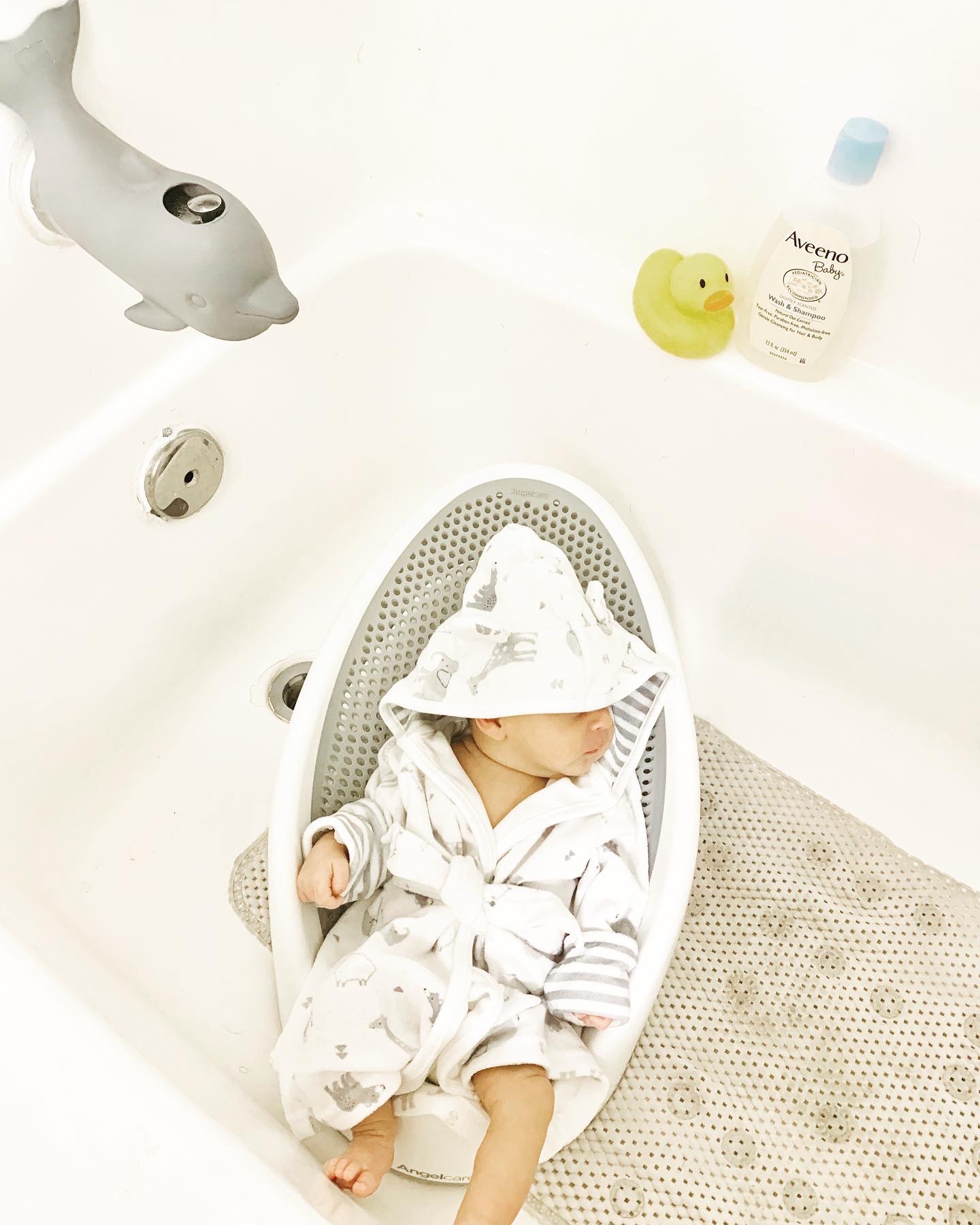 Next, I put Quincy in her bath robe and placed her in the bath on her bath seat. The bath robe, rubber duck, Aveeno bath wash, and bath seat are both from Target. I got the dolphin protective cover from Marshall’s.
