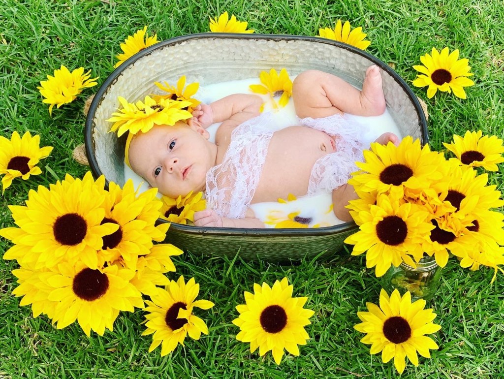 For these milk bath pictures, I added two mason jars of sunflowers along with some spread around the bucket and inside the bucket. I kept the bath towel below her for comfort. Then, I filled the bucket with one gallon of milk and about 3 pitchers of warm water. She screamed with the cold milk, but with warm water added she got completely comfortable. Looking back, I would make a milk and warm water mixture first before putting her in. I used lace purchased previously at Michaels to maintain her modesty, and this picture was complete. I took this picture on my knees pointed downward at an angle.