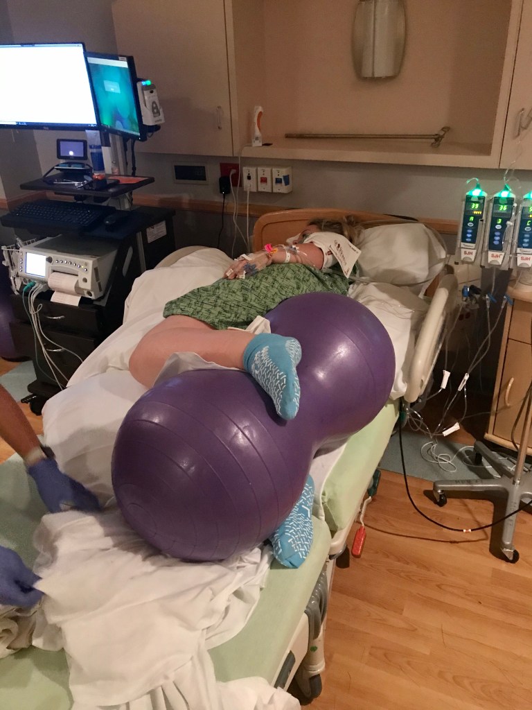 The actual labor was a very long and tiring process. I was induced midday Thursday, but I wasn’t really dilating, so they put a balloon inside to speed up the process. The balloon was very painful, but It got me dilated enough to officially be in labor. I got an epidural as soon as the anesthesiologist was available because I was afraid I wouldn’t get the medication before it was too late. Despite having an epidural, I was able to move around very well and easily. My nurses and doctors were shocked. Apparently the epidural didn’t work as well on me because I felt pain and cramping throughout my entire labor. During labor, they put you in a variety of awkward positions, as you can see from my pictures above. This is all to help dilate you.