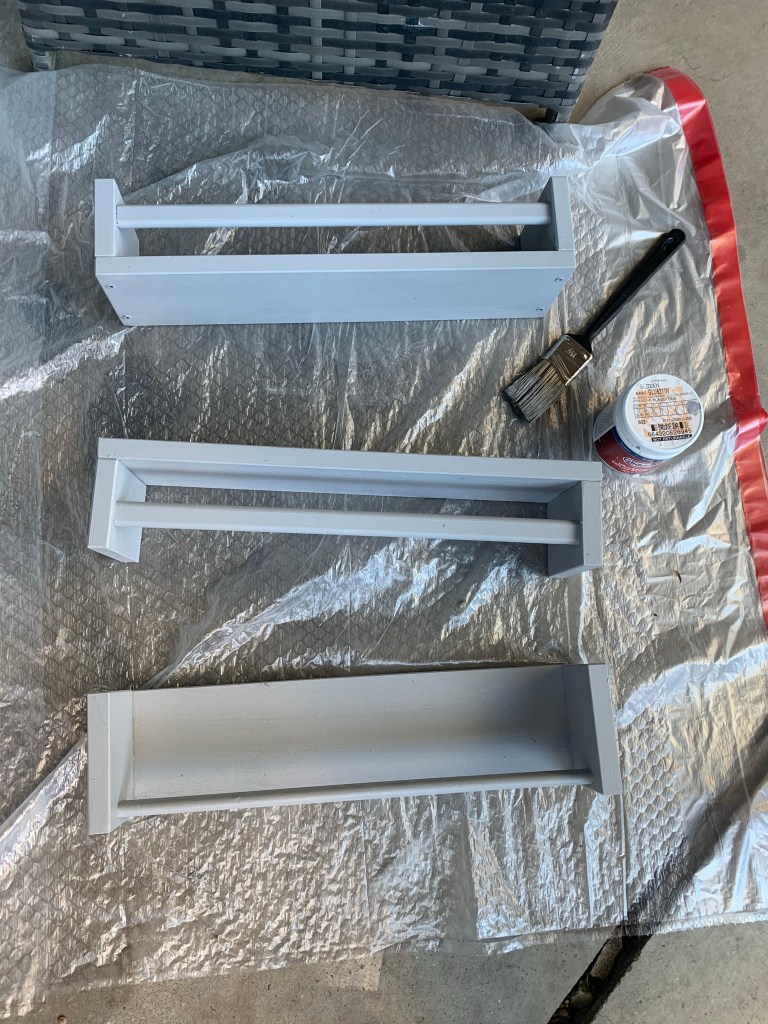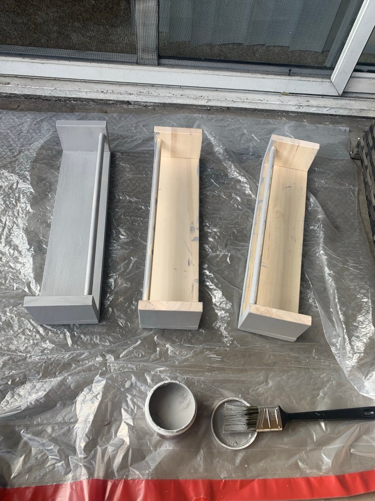 In order to make my daughters bookshelves, I first had to gather materials. I got my 3 bookshelves from IKEA. Next, I chose to paint the shelves grey to match my daughters room. I used Glidden Paint in the color Satin and Dollar Tree paint brushes. It took me about two days to paint because I only painted when my baby was asleep, and I did 2 coats.